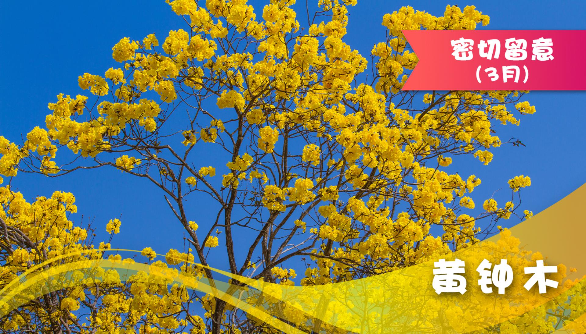 又名黄花风铃木,原生于中南美洲的墨西哥至委内瑞拉一带,是紫葳科落叶乔木,树高可达20米。开花时,花叶不相见;花开金黄,形状有如风铃,盛放时一球球金黄色花序高挂枝头,满目。本港通常三月开花。每株树的花期甚短,为时约一两周。